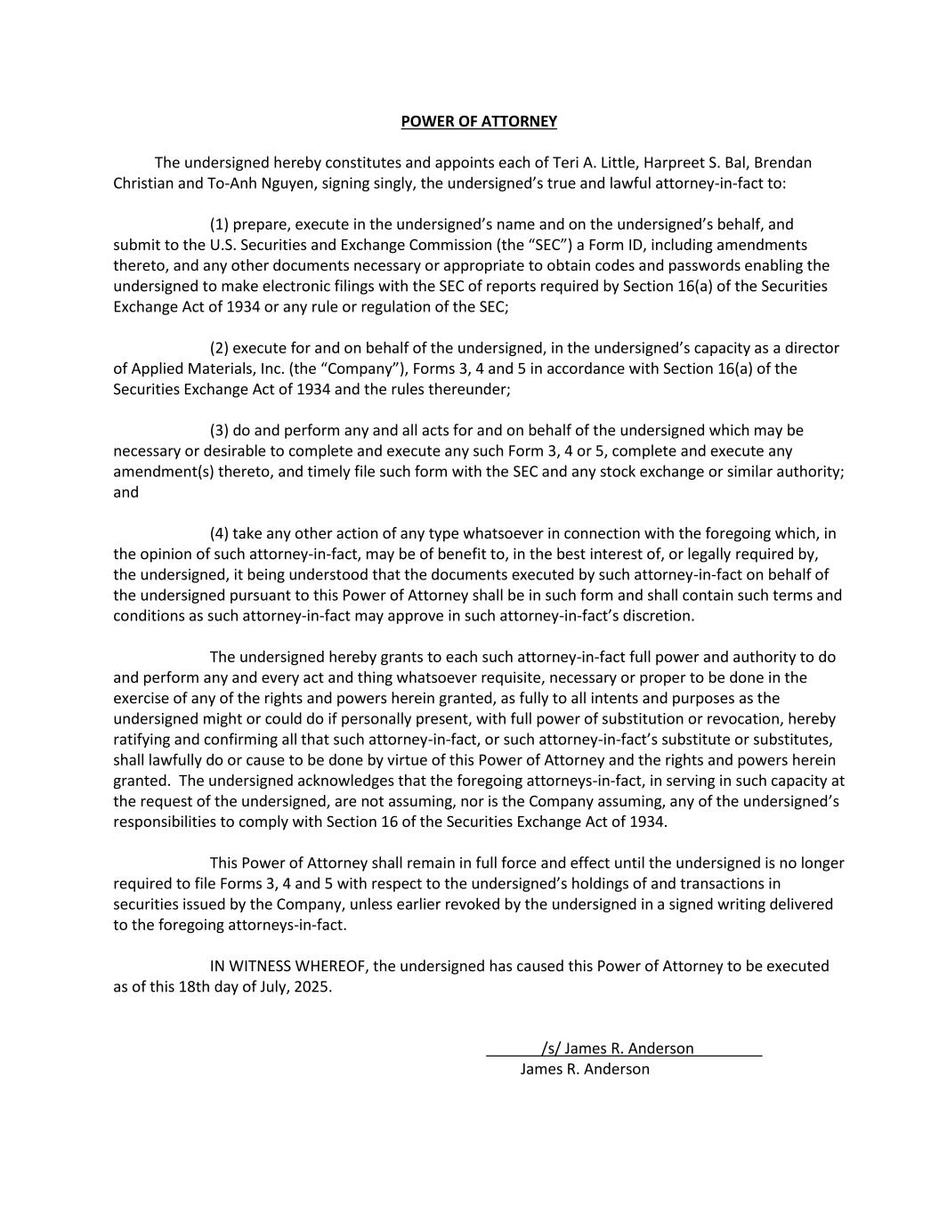 POWER OF ATTORNEY The undersigned hereby constitutes and appoints each of Teri A. Little, Harpreet S. Bal, Brendan Christian and To-Anh Nguyen, signing singly, the undersigned’s true and lawful attorney-in-fact to: (1) prepare, execute in the undersigned’s name and on the undersigned’s behalf, and submit to the U.S. Securities and Exchange Commission (the “SEC”) a Form ID, including amendments thereto, and any other documents necessary or appropriate to obtain codes and passwords enabling the undersigned to make electronic filings with the SEC of reports required by Section 16(a) of the Securities Exchange Act of 1934 or any rule or regulation of the SEC; (2) execute for and on behalf of the undersigned, in the undersigned’s capacity as a director of Applied Materials, Inc. (the “Company”), Forms 3, 4 and 5 in accordance with Section 16(a) of the Securities Exchange Act of 1934 and the rules thereunder; (3) do and perform any and all acts for and on behalf of the undersigned which may be necessary or desirable to complete and execute any such Form 3, 4 or 5, complete and execute any amendment(s) thereto, and timely file such form with the SEC and any stock exchange or similar authority; and (4) take any other action of any type whatsoever in connection with the foregoing which, in the opinion of such attorney-in-fact, may be of benefit to, in the best interest of, or legally required by, the undersigned, it being understood that the documents executed by such attorney-in-fact on behalf of the undersigned pursuant to this Power of Attorney shall be in such form and shall contain such terms and conditions as such attorney-in-fact may approve in such attorney-in-fact’s discretion. The undersigned hereby grants to each such attorney-in-fact full power and authority to do and perform any and every act and thing whatsoever requisite, necessary or proper to be done in the exercise of any of the rights and powers herein granted, as fully to all intents and purposes as the undersigned might or could do if personally present, with full power of substitution or revocation, hereby ratifying and confirming all that such attorney-in-fact, or such attorney-in-fact’s substitute or substitutes, shall lawfully do or cause to be done by virtue of this Power of Attorney and the rights and powers herein granted. The undersigned acknowledges that the foregoing attorneys-in-fact, in serving in such capacity at the request of the undersigned, are not assuming, nor is the Company assuming, any of the undersigned’s responsibilities to comply with Section 16 of the Securities Exchange Act of 1934. This Power of Attorney shall remain in full force and effect until the undersigned is no longer required to file Forms 3, 4 and 5 with respect to the undersigned’s holdings of and transactions in securities issued by the Company, unless earlier revoked by the undersigned in a signed writing delivered to the foregoing attorneys-in-fact. IN WITNESS WHEREOF, the undersigned has caused this Power of Attorney to be executed as of this 18th day of July, 2025. /s/ James R. Anderson James R. Anderson